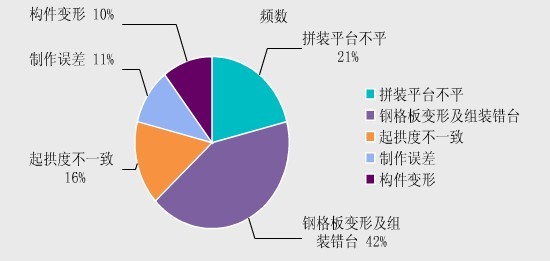 如何提高雨水溝蓋板安裝精度,最大限度減少雨水溝蓋板施工質量通病,通過對雨水溝蓋板施工中存在的問題進行調查查并整理,希望各施工單位能夠根據常見施工質量問題,舉一反三,查找存在的質量問題并及時修改,制定相關的預防措施。通過大量的統計數據顯示,雨水溝蓋板變形及拼裝平臺不平整是影響雨水溝蓋板安裝平整度最主要的原因,所占比例高達60%以上。影響雨水溝蓋板安裝精度原因主要有以下幾個方面,看下圖。